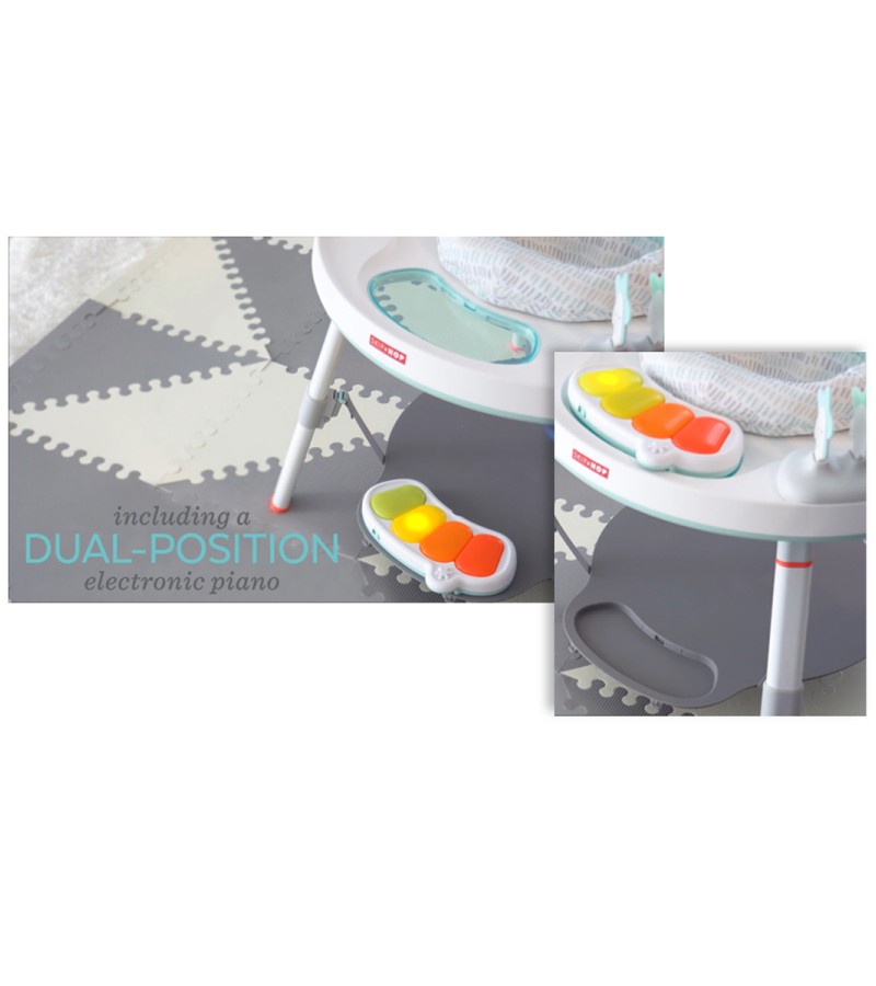 Ages 4m+Three stages of use: Sit, swivel, bounce & play; Cruise & interact; Play table25+ developmental activitiesDiscovery Window lets baby see piano and their feet while playing to learn cause and effect through spatial awarenessConverts to a play table with smooth plastic chalkboard surfaceClip-on toys can be positioned based on baby's abilitiesFour movable toys include: peekaboo clouds that pop up and squeak, wobble lamb with rattle beads, swaying stars move back and forth and sun bead mover with spinnerMusical light-up piano with three ways to play: piano mode, song mode and motion sensor modeIncludes suction bird snack bowl; dishwasher-safe360-degree rotating seat that stretches for bouncing and includes toy loops to attach toysFoot support platform adjusts to the perfect heightLegs detach for easy storageRequires three AAA batteries (not included)Phthalate-freeSize (inches): 31l x 31w x 18.5h; (cm): 79l x 79w x 47h