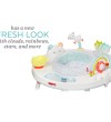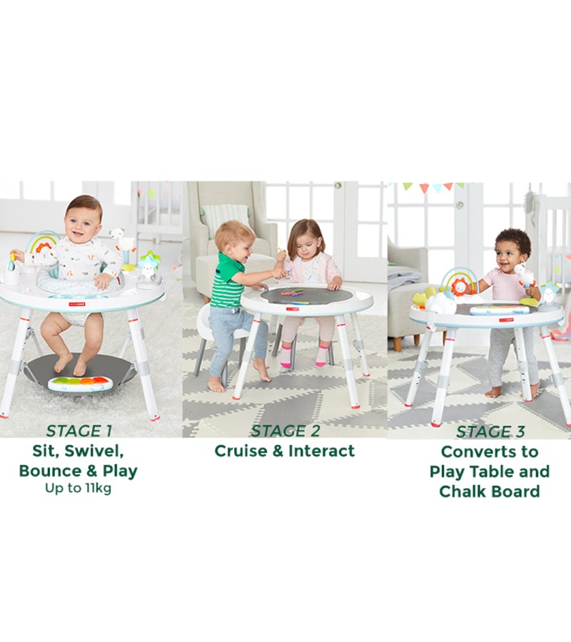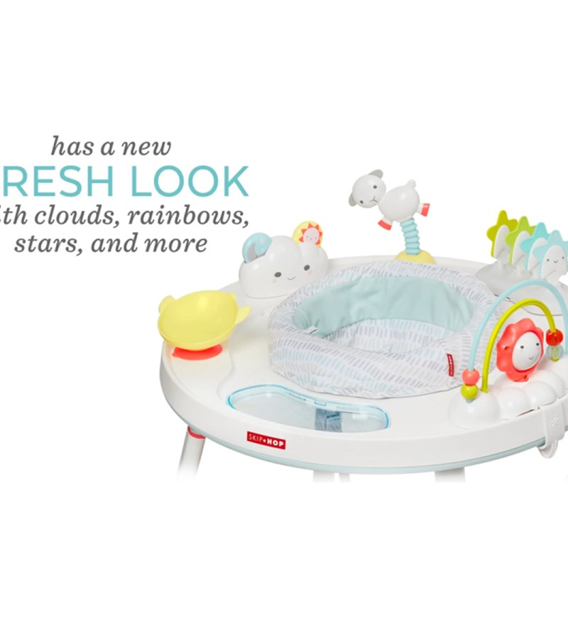 Designed to grow with baby in three stages, Skip Hop's Silver Lining Cloud Baby's View Activity Center is an action-packed take on our best-selling gym. Feauturing the same developmental approach to play and learning as our Explore & More version, the dcor-friendly design features a 360-degree rotating seat that turns and stretches for bouncing. Our unique Discovery Window gives little ones a clear view of their feet as they play the light-up piano to connect cause and effect. Four dreamy toys can be rearranged for customized play. As baby grows, the activity center converts for easy cruising. At stage three, it transforms into a sturdy toddler table with a plastic chalkboard surface for drawing, playingthe sky's the limit!