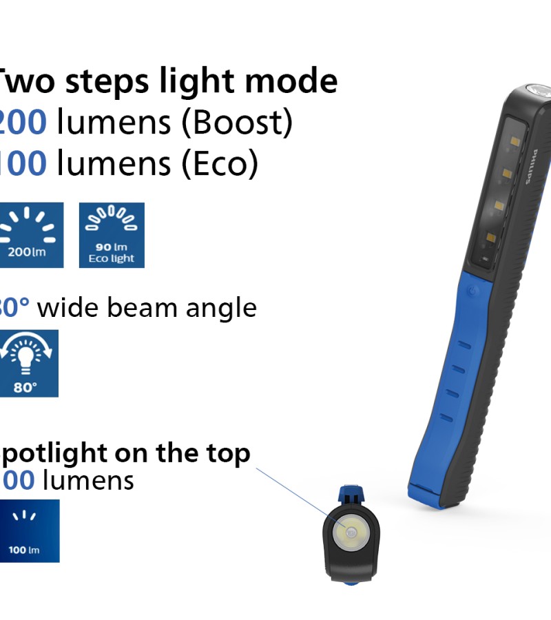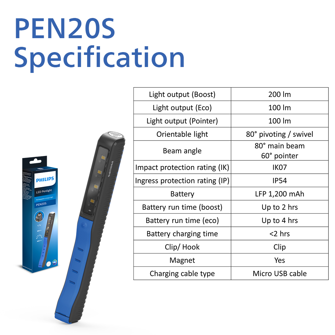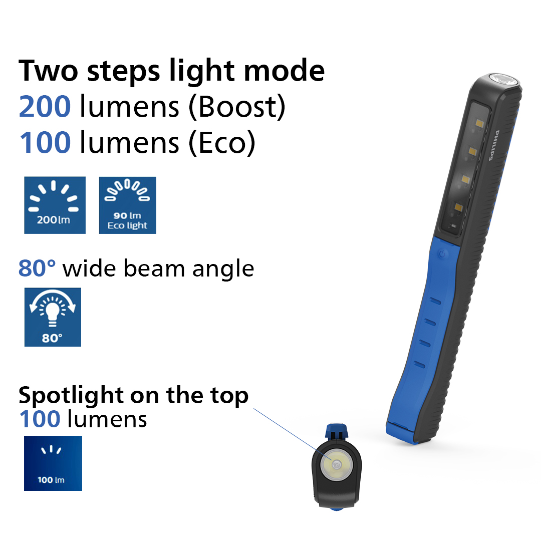 The Philips PEN20S is a compact penlight, ideal for quick inspection jobs. Its 4 high-quality LEDs provide a bright, natural white light of 6000 K, producing up to 200 lm, plus a 100 lm spotlight. Recharge via USB and use hands-free.